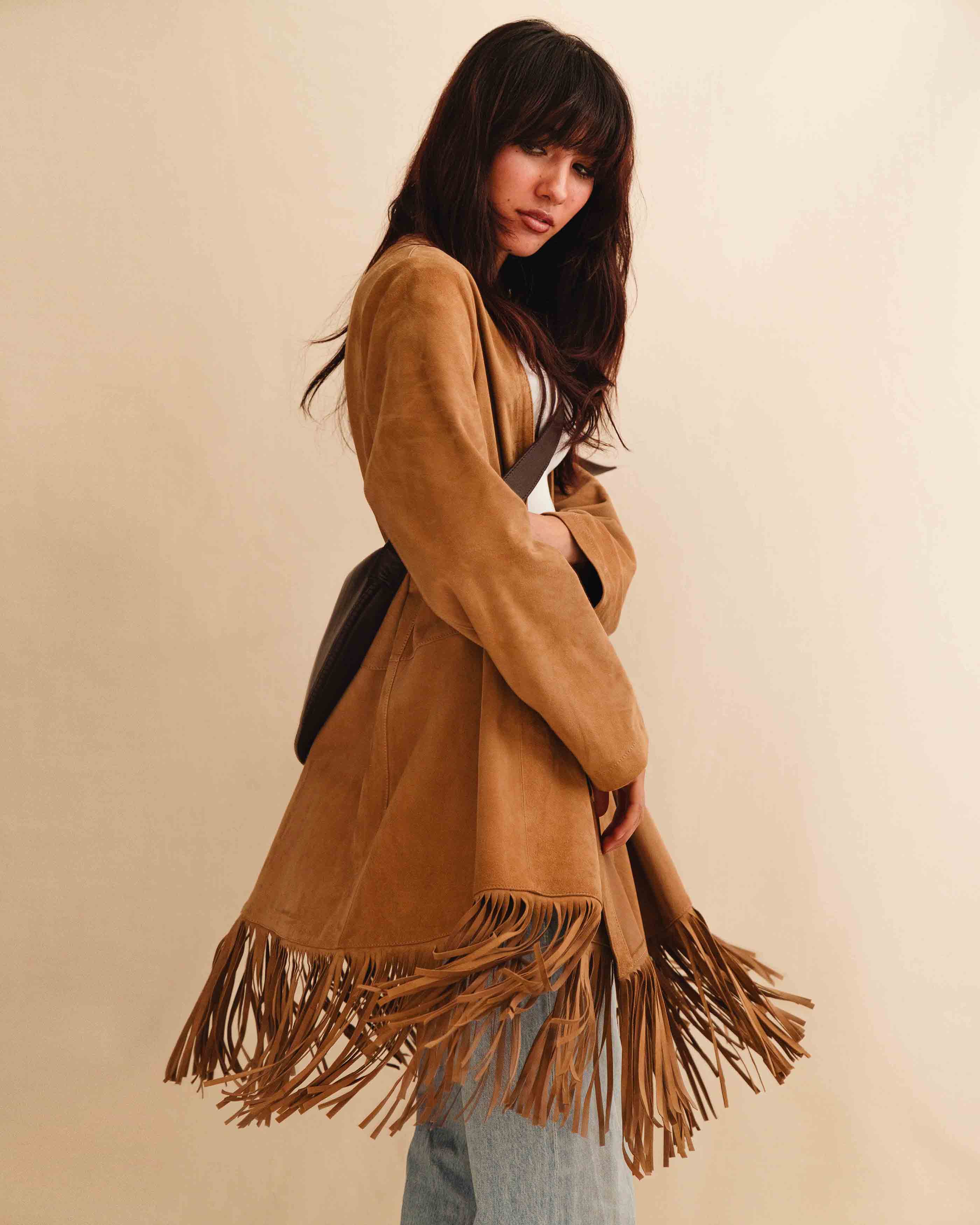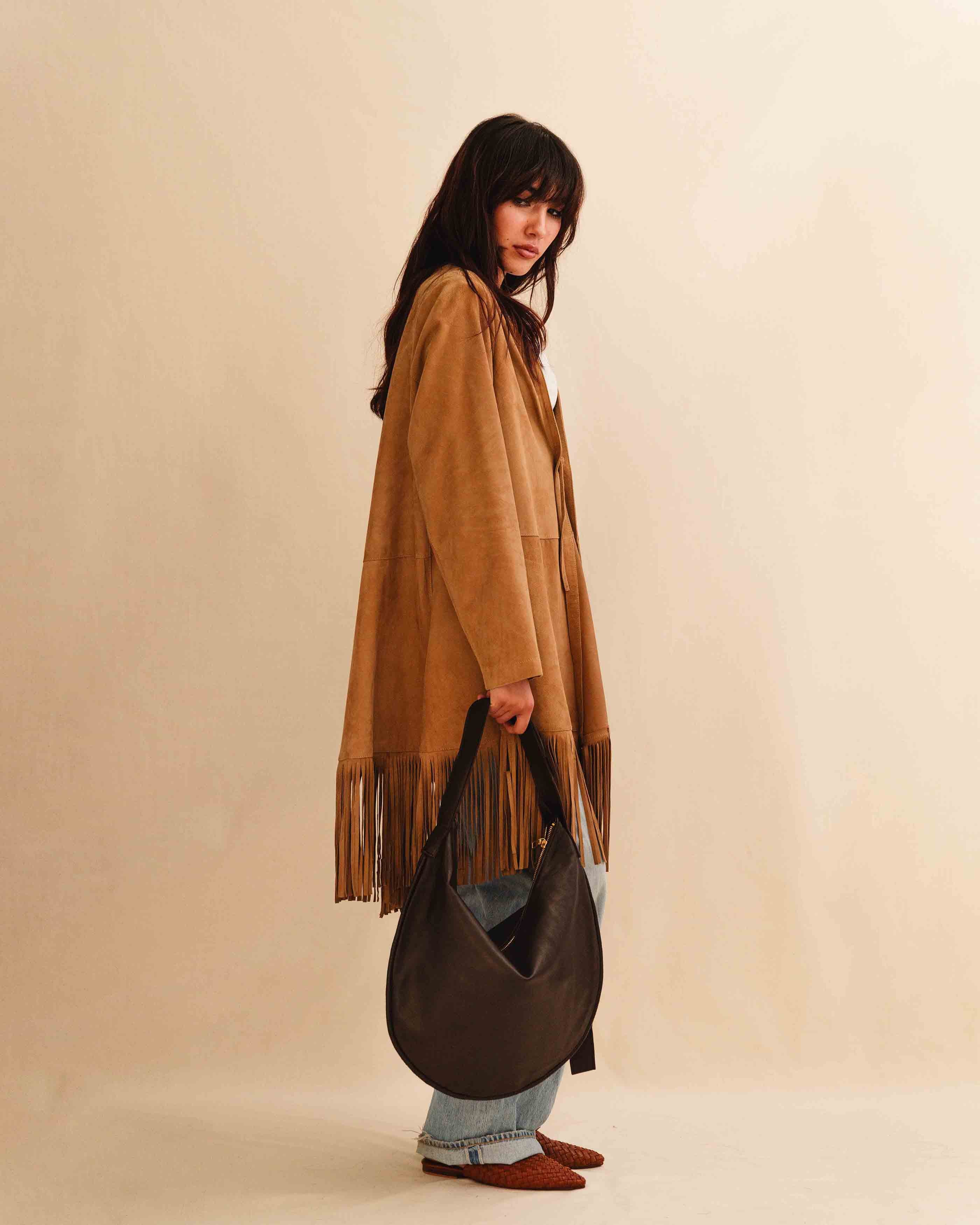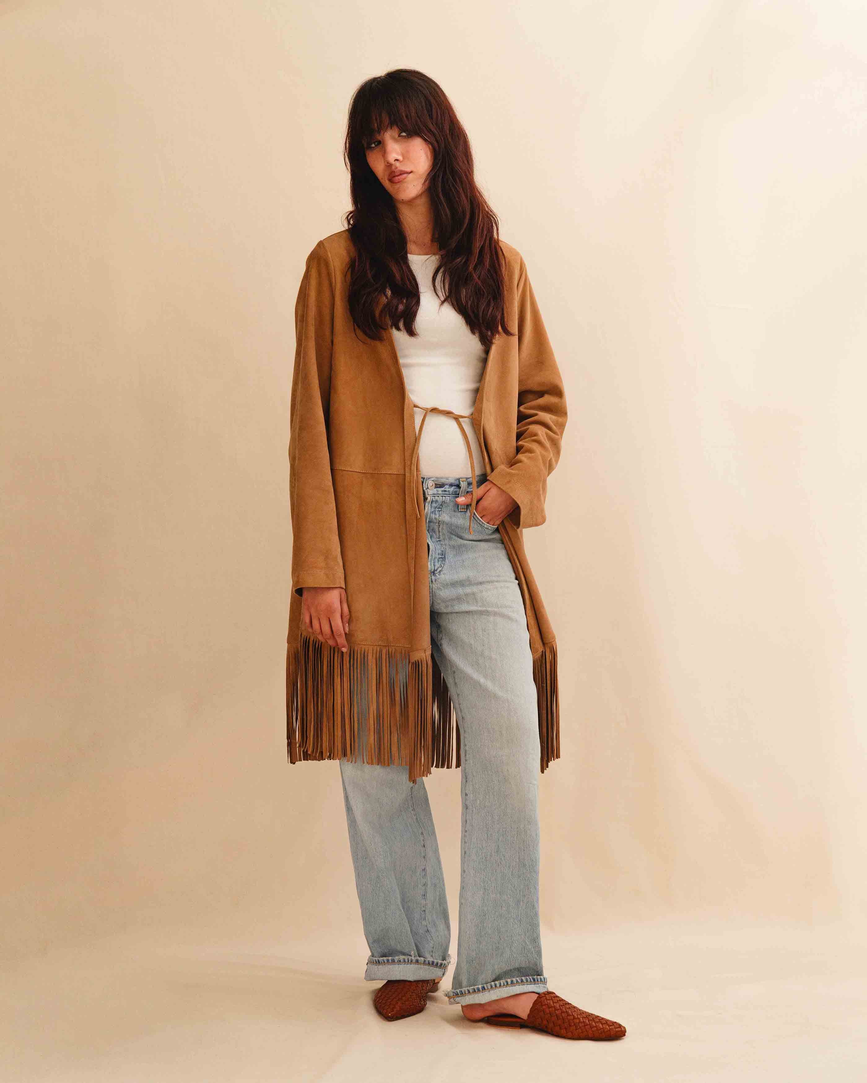 Fringes Coat ADRIA in Sand Velor: Easy leather coat with fringes.